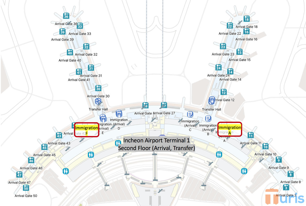 Bandara Incheon memiliki dua terminal penumpang yakni Terminal 1 dan Terminal 2. Pada saat tiba di Korea Selatan melalui Bandara Incheon, pesawat yang kamu tumpangi akan menggunakan Terminal 1 atau Terminal 2 untuk menurunkan penumpang. Setelah kamu turun dari pesawat, kamu akan berjalan di koridor kedatangan untuk memulai berbagai tahapan pada prosedur kedatangan. Kalau kamu ingin mendaftarkan diri pada layanan SES, pendaftaran dapat dilakukan pada meja pendaftaran SES yang berada di sekitar area pemeriksaan imigrasi pada tiap terminal.
