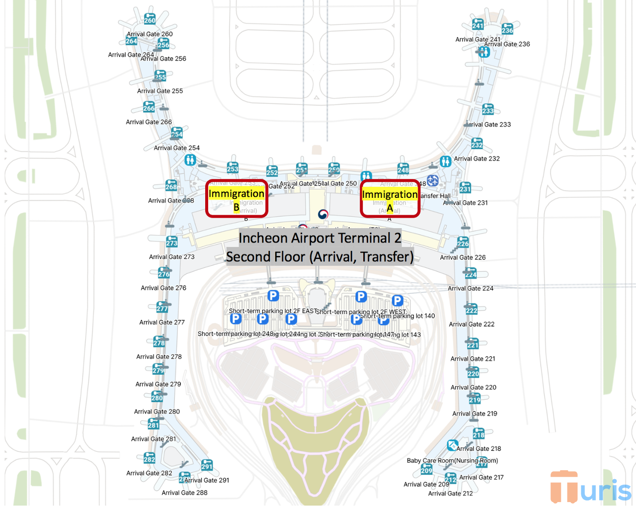 Seperti halnya di Terminal 1, meja pendaftaran SES di Terminal 2 juga berada di area klirens keimigrasian. Setelah melewati gerbang pemeriksaan kesehatan, kamu akan memasuki area klirens keimigrasian. Terdapat dua lokasi meja pendaftaran SES di Terminal 2. Lokasi pertama berada di Imigrasi Kedatangan A, dekat Gate 248. Lokasi lainnya berada di Imigrasi Kedatangan B, dekat Gate 253. Meja pendaftaran SES di Imigrasi Kedatangan A Terminal 2 buka 24 jam setiap hari. Sementara itu, meja pendaftaran SES di Imigrasi Kedatangan B buka setiap hari dari pukul 05:00 – 20:00 KST.